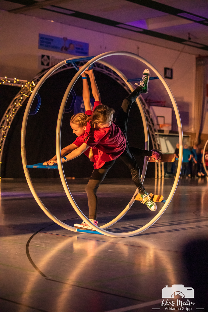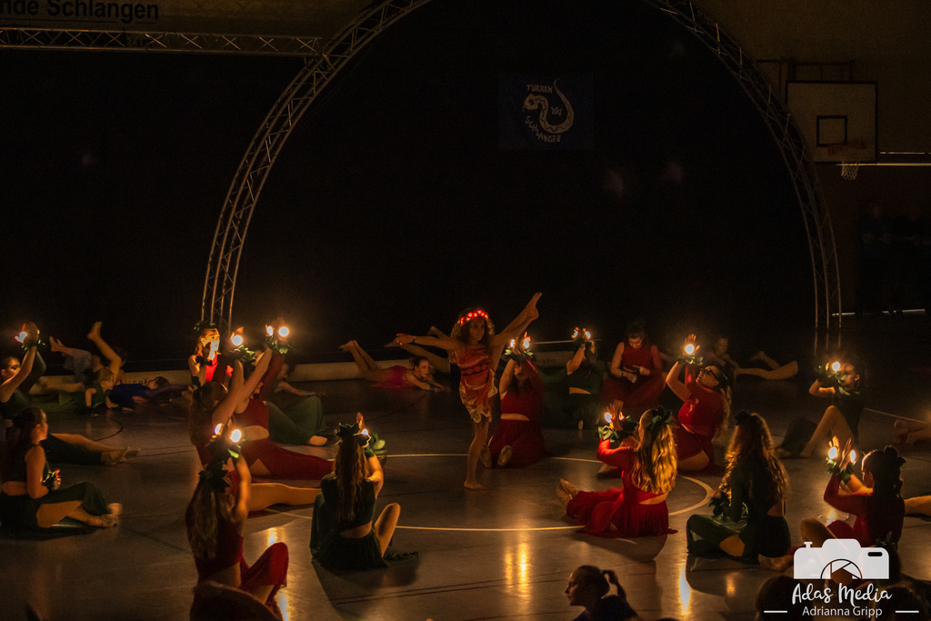 Nach der Pause erwartete die Zuschauenden ein Coldplay-Medley, gesungen von den Crasy Snakes und Snake Town Girls. Das Jungenturnen und die älteste Mädchenturngruppe unternahmen eine Reise auf die „Rennstrecke des Geräteturnens“ und verbanden rasante Rollbrett-Fahrerei mit eleganten Übungen auf der Air-Track Bahn, dem Sprung und dem Schwebebalken. Beeindruckende Einrad- und Jonglagekunst zeigte die gleichnamige Gruppe des VfL und versetzte das Publikum mit ihrer kreativen Präsentation unter dem Motto „Tohubawohu“ in Staunen. Für Gänsehaut sorgten ebenfalls die Rhönradauftritte. Die Jüngeren zeigten ihre vielfältigen und sauber ausgeführten Lieblingsübungen in den Rädern und die Erwachsenengruppe schwebte in nahezu vollständiger Dunkelheit mit beleuchteten Rädern durch die Halle und erzeugten ein faszinierendes Lichtspiel. Krönender Abschluss war die große „Vaiana“-Choreografie mit 67 Tänzerinnen der KGW und TGW Gruppen. Mit beeindruckender Synchronität, Ausdruckskraft und spürbarer monatelanger Vorbereitung erzählten sie gemeinsam die Geschichte von Vaiana – kraftvoll, emotional und mitreißend. Doch damit nicht genug: Zum großen Finale kamen noch einmal alle Teilnehmenden gemeinsam auf die Fläche. Ein letzter Moment des Zusammenhalts, den das Publikum mit Standing Ovations belohnte.