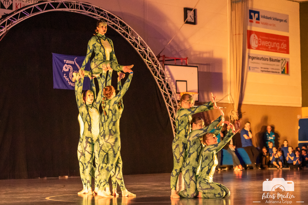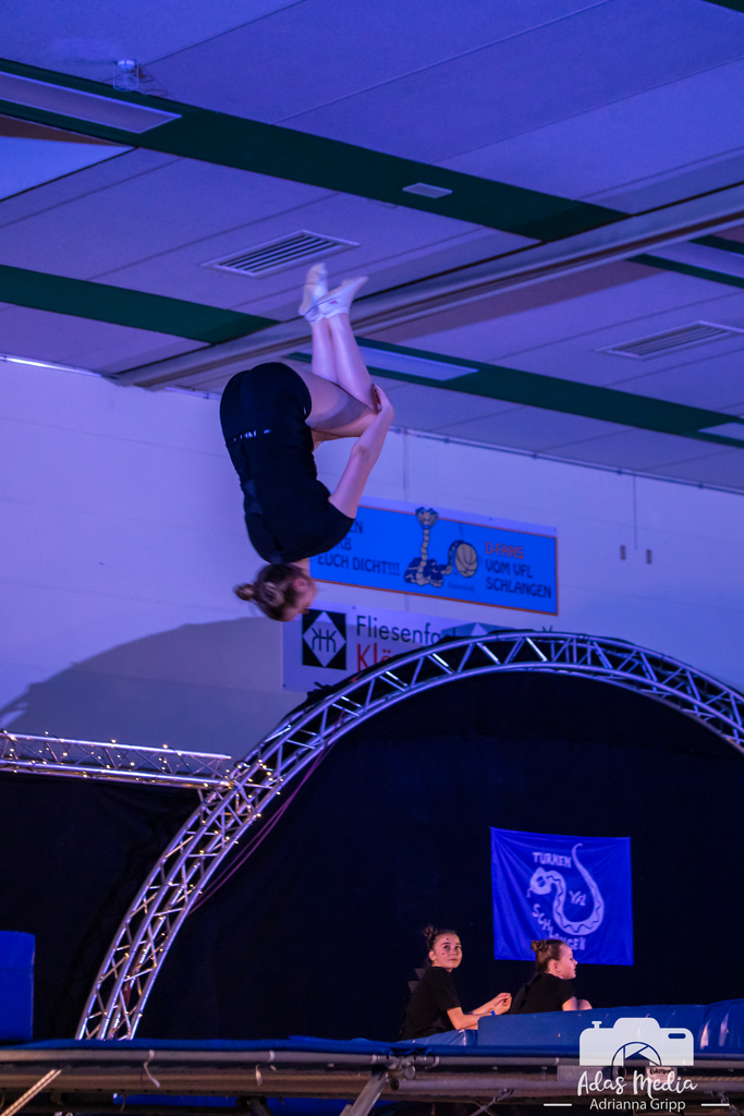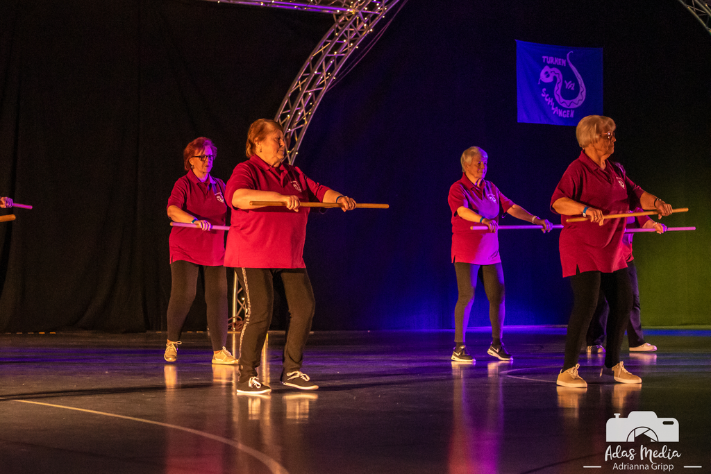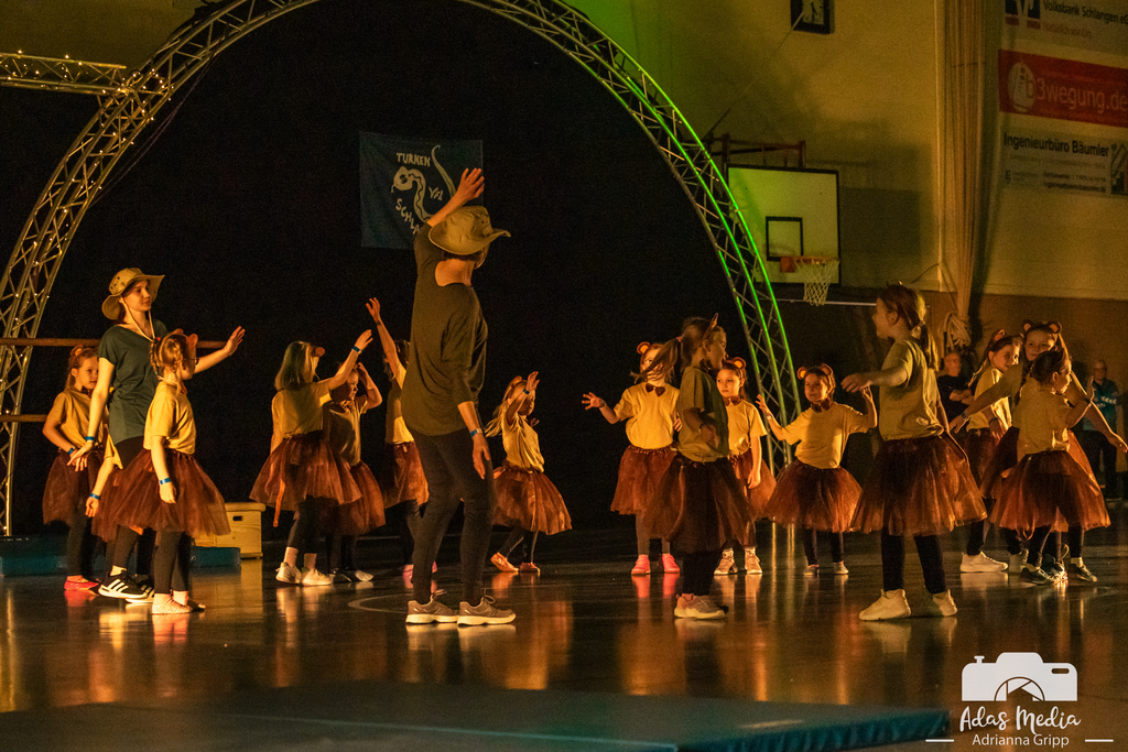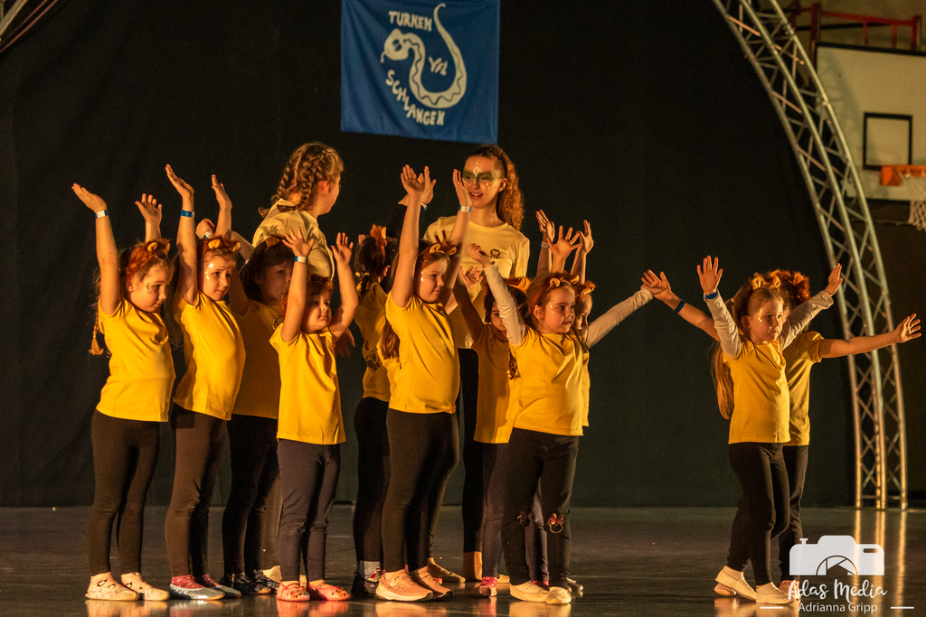 Ein echter Herzensmoment: Die Tanzmäuse – die jüngsten gerade einmal drei Jahre alt – meisterten ihren Auftritt zum Thema „Löwen“ allein auf der Bühne. Spätestens hier schmolz das Publikum dahin. Von den Löwen ging es zu Schlangen – die beliebte und mehrmals ausgezeichnete Gruppe Crazy Snakes nutze die Gelegenheit, ihren ausdrucksstarken „Snake Dance“ noch einmal zu präsentieren. Ebenso beeindruckend: die Seniorensport-Gruppe mit der Stab-Gymnastik, die einmal mehr bewies, dass Begeisterung für Bewegung keine Altersgrenze kennt. Die Eltern-Kind-Gruppe sowie das Kinderturnen nahmen die Zuschauenden mit in eine farbenfrohe und fantasievolle Welt voller Sonne, Regen und Regenbögen, wohingegen die Turnerinnen im Grundschulalter mit ihrer Show einen aufregenden und abwechslungsreichen Ausflug in den Dschungel machten. Mit Spannung erwartet wurde der erste Auftritt der neuen Line-Dance-Gruppe – und sie lieferten ab! Rhythmisch, mitreißend und mit spürbarer Freude präsentierten sie sich erstmals beim Schauturnen. Anschließend nahmen die Dancing-Daisys das Publikum mit auf eine „Mission Impossible“ und sorgten für echte Agenten-Atmosphäre in der Sporthalle. Spektakuläre Höhenflüge, atemberaubende Sprünge und eine Dynamik, die das Publikum immer wieder staunen ließ, zeigten die Trampolingruppen in ihrer gemeinsamen Show.